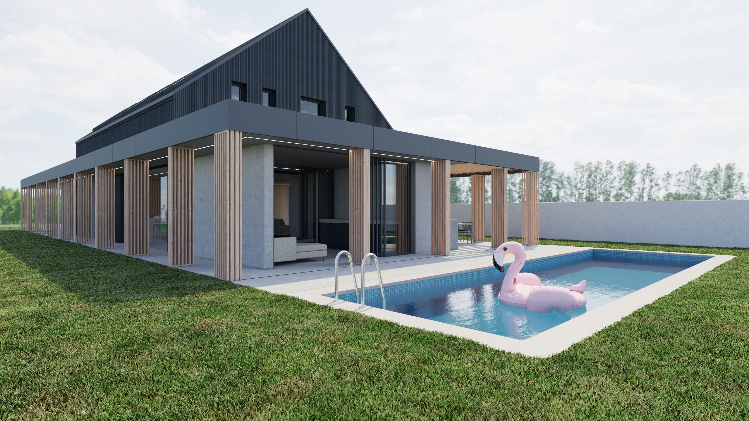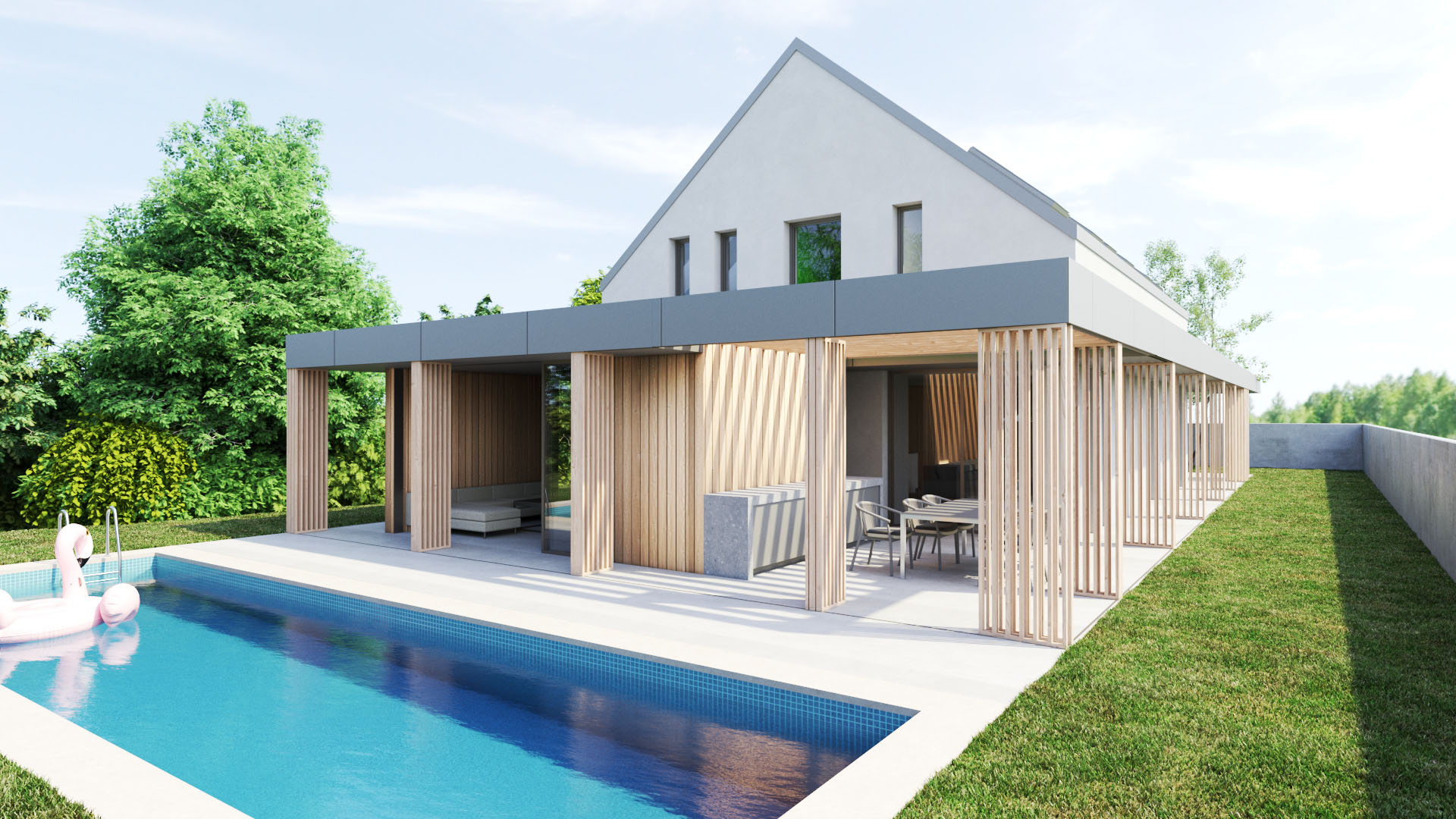 Pergola se odpre proti bazenu, kjer ustvari pokrit zunanji bivalni prostor z letno kuhinjo ter udoben zunanji “lounge”. Hiša s tem ponuja razkošen in funkcionalen zunanji prostor za druženje in sprostitev. Bazen in terasa sta neposredna podaljška zunanjih bivalnih prostorov. Zunanji prostori so zasnovani tako, da jih je mogoče uporabljati skoraj celo leto.